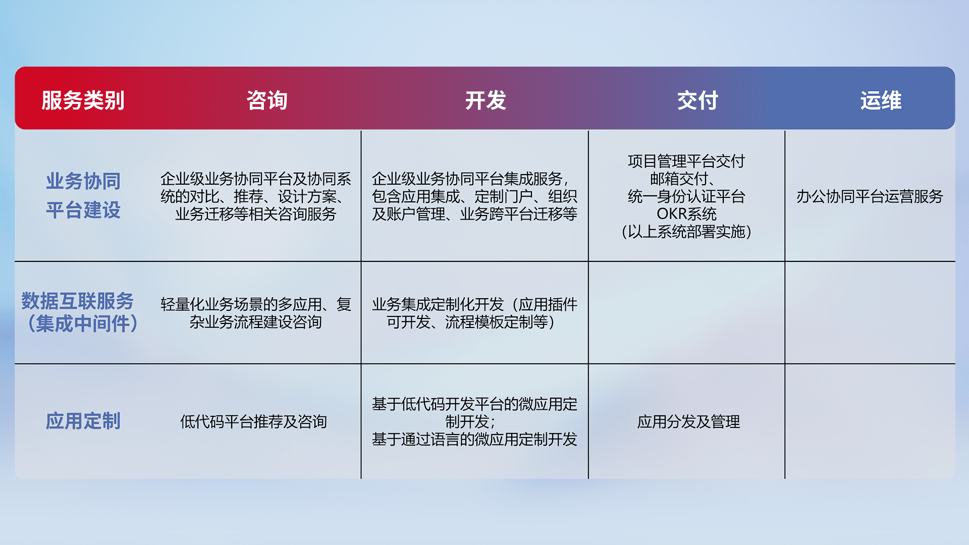 针对钉钉、、、、企微、、、、IDaas等平台级产品提供产品的规划、、方案、、交付、、、、定制化开发等服务,,实现如统一协同办公、、、、智能客户服务、、、、混合会议管理、、、智能数据查询、、、、等业务场景,,实现数字化转型。。。。