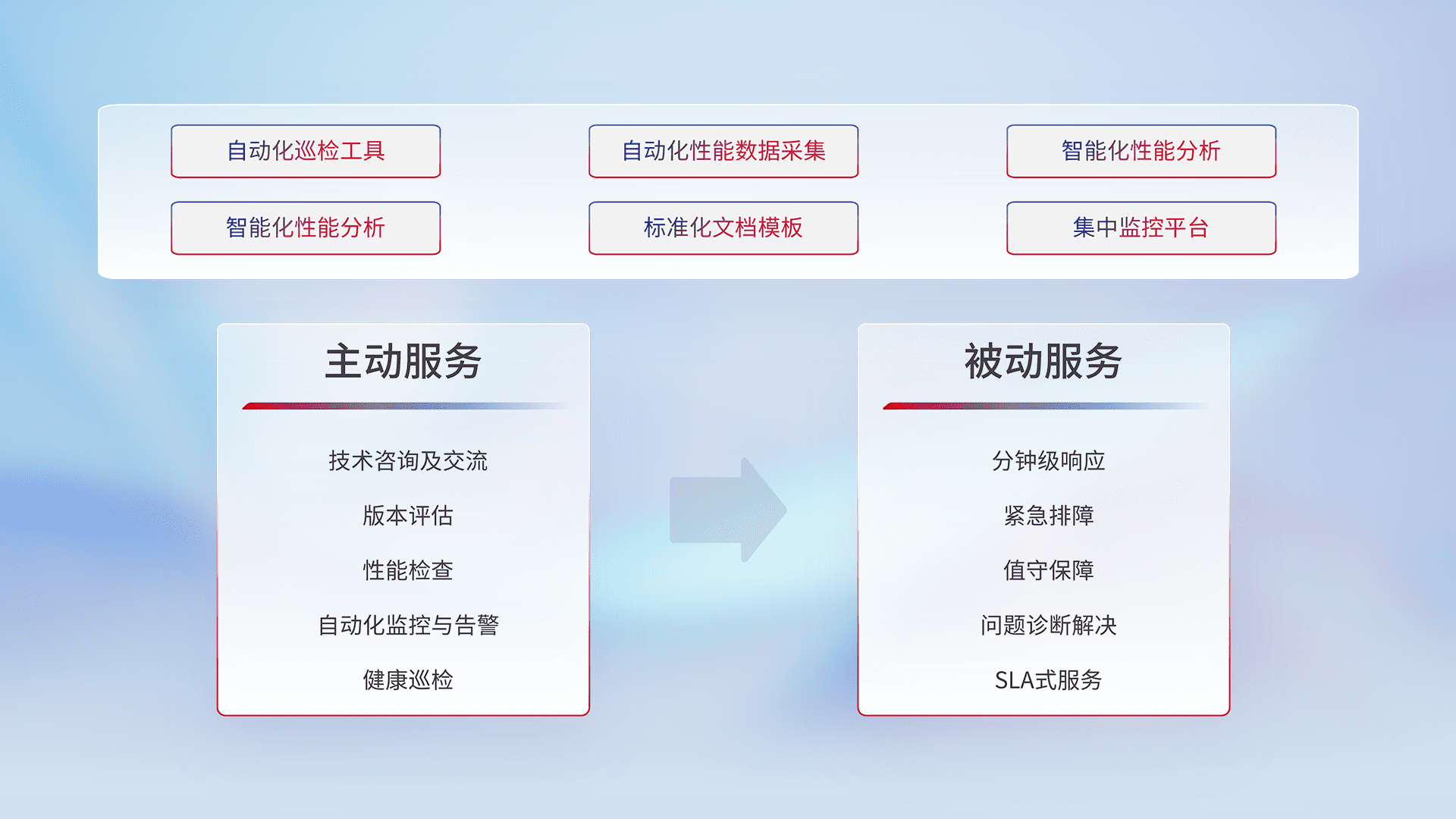 智能化工具和标准化文档,,保障服务质量,,提供主动服务(包含技术咨询、、、、版本评估、、性能检查、、、、自动化监控与告警、、、、健康巡检)和被动服务包含(分钟级响应、、、紧急排障、、、值守保障、、、问题诊断解决、、SLA服务)。。。。
